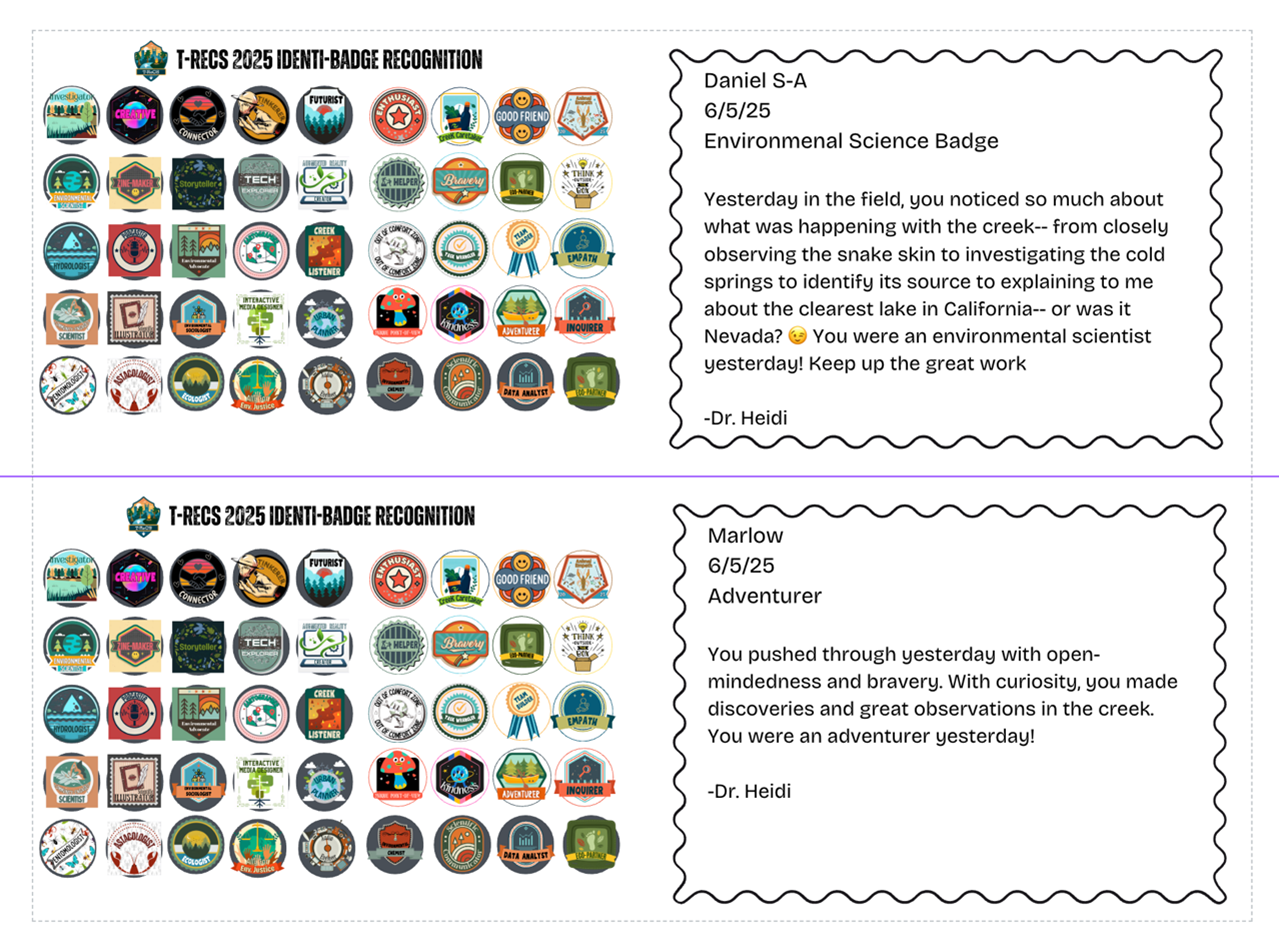 Throughout the camp, the research team and camp counselors honored students’ participation with STEM “identi-badges” that conveyed how the team viewed each camper’s STEM identity development. The badges affiliated students with around 40 unique STEM professions and self-concepts, including as hydrologists, animal empaths, water chemists, and creek caretakers.